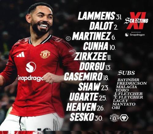 曼联vs狼队:库尼亚搭档谢什科,齐尔克泽、卡塞米罗首发