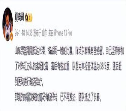 不过,山东男篮还是遇上了新麻烦,根据山东媒体人夏晓司的报道,山东男篮阵中两大核心都出现了感冒,一个是陈培东,他带病坚持打了对阵江苏队的比赛,可惜效果不佳。由于是带病出战,赛后,陈培东的感冒加重,体温飙升到了38.5度,只能赶到医院输液。如此来看,陈培东大概率是要缺席对阵吉林队的比赛了。